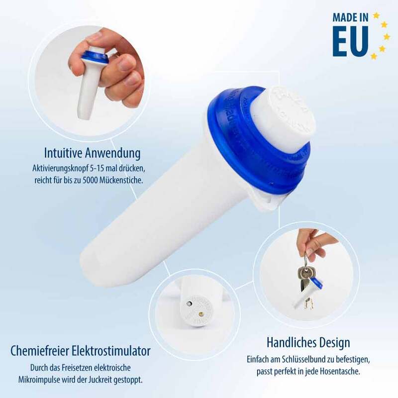 Der chemiefreie Elektrostimulator arbeitet mit Piezoelektrizität. Anders als bei thermischen Stichheilern sind bei unserem Produkt daher keine Batterien für die Funktion erforderlich. Dies wiederum ermöglicht ein kleines und handliches Design, was sich perfekt für die Mitnahme in der Hosentasche eignet.DEUTSCHE MARKENQUALITÄT:
