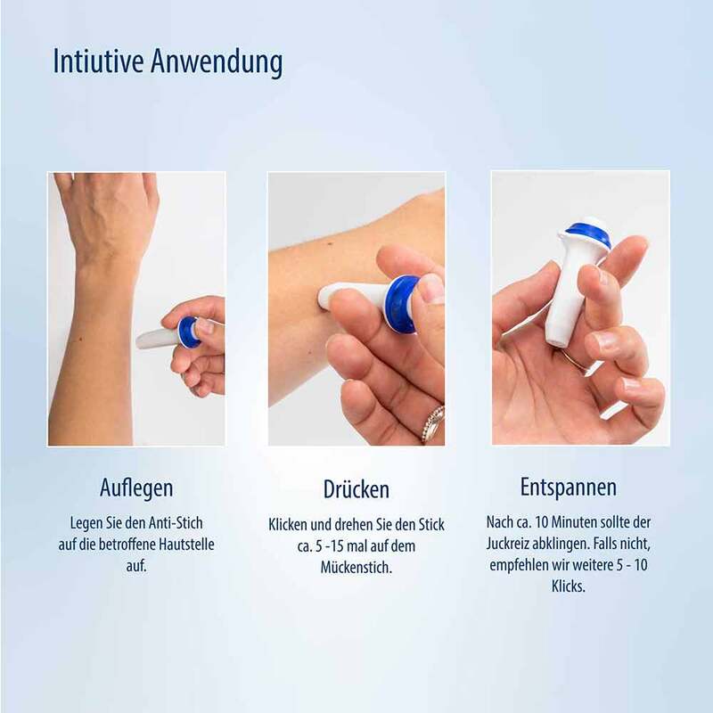 Die Anwendung des Insektenstichheilers ist absolut intuitiv. Einfach auf die betroffene Stelle auftragen und den Aktivierungsknopf ca 5-15 mal drücken.Der Mückenstift reicht für bis zu 1.000 Mückenstiche!