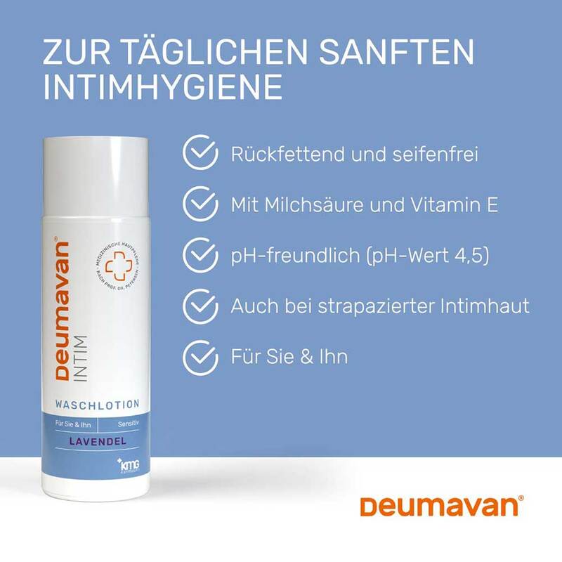 Durch ihre besondere Formulierung mit dem „Medizinischen Hautschutz nach Prof. Dr. Petersen“ wird die DEUMAVAN Waschlotion Lavendel den Anforderungen der sensiblen Intim- und Analhaut gerecht.