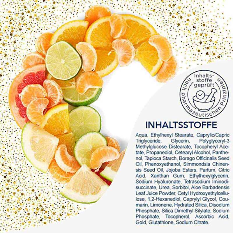 Die leichte frei öl® FeuchtigkeitsCreme GOLD mit weiterentwickeltem Hydro-BoosterComplex und pharmazeutischem Hyaluron versorgt die Haut sofort und langanhaltend mit Feuchtigkeit. Hochkonzentriertes Vitamin C stabilisiert durch feinste Goldpartikel wirkt besonders schnell und effizient. Als starkes Antioxidans schützt es die Haut vor freien Radikalen, regt den Zellschutz an und wirkt ausgleichend auf das Hautbild. Es stimuliert den Kollagenaufbau, stabilisiert und strafft die Hautstruktur und glättet Falten und Linien. Die Haut ist intensiv hydratisiert, gewinnt an Spannkraft und Glow und scheint praller und ebenmäßiger.