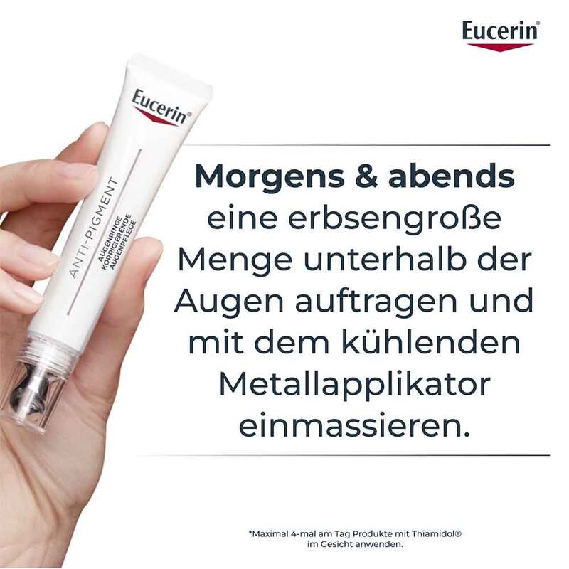 Die Haut am Morgen z.B. mit der Eucerin Anti-Pigment Tagespflege LSF 30 oder der Eucerin HYALURON-FILLER Tagespflege LSF 30 mit Feuchtigkeit versorgen. Am Abend die Eucerin Anti-Pigment Nachtpflege oder die Eucerin HYALURON-FILLER Nachtpflege verwenden. Für optimale Ergebnisse das Eucerin Anti-Pigment Dual Serum vor der Feuchtigkeitspflege auftragen. Die Eucerin Anti-Pigment Augenringe korrigierende Augenpflege nach der Tages- oder Nachtpflege unterhalb der Augen auftragen. Maximal 4 Mal am Tag Produkte mit Thiamidol® anwenden.