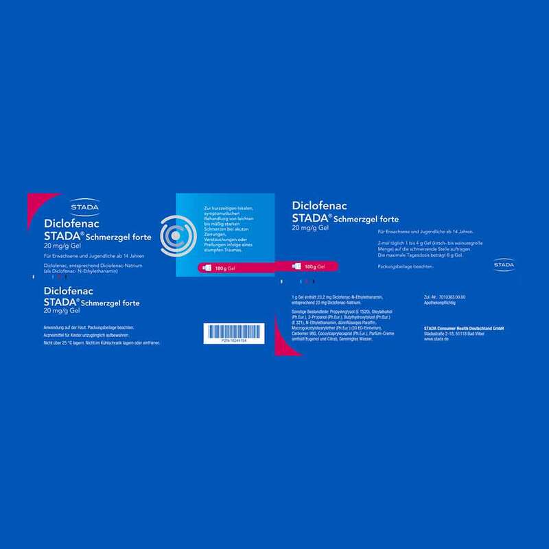 Diclofenac STADA® Schmerzgel forte 20 mg/g Gel. Für Erwachsene und Jugendliche ab 14 Jahren Wirkstoff: Diclofenac, entsprechend Diclofenac-Natrium (als Diclofenac-N-Ethylethanamin). Zur kurzzeitigen lokalen, symptomatischen Behandlung von leichten bis mäßig starken Schmerzen bei akuten Zerrungen, Verstauchungen oder Prellungen infolge eines stumpfen Traumas. Hinweis: Enthält Propylenglycol, Butylhydroxytoluol und Parfüm-Creme (enthält Eugenol und Citral). Die maximale Tagesgesamtdosis beträgt 8 g Gel. Zu Risiken und Nebenwirkungen lesen Sie die Packungsbeilage und fragen Sie Ihre Ärztin, Ihren Arzt oder in Ihrer Apotheke. STADA Consumer Health Deutschland GmbH, Stadastraße 2–18, 61118 Bad Vilbel Stand: Juli 2024