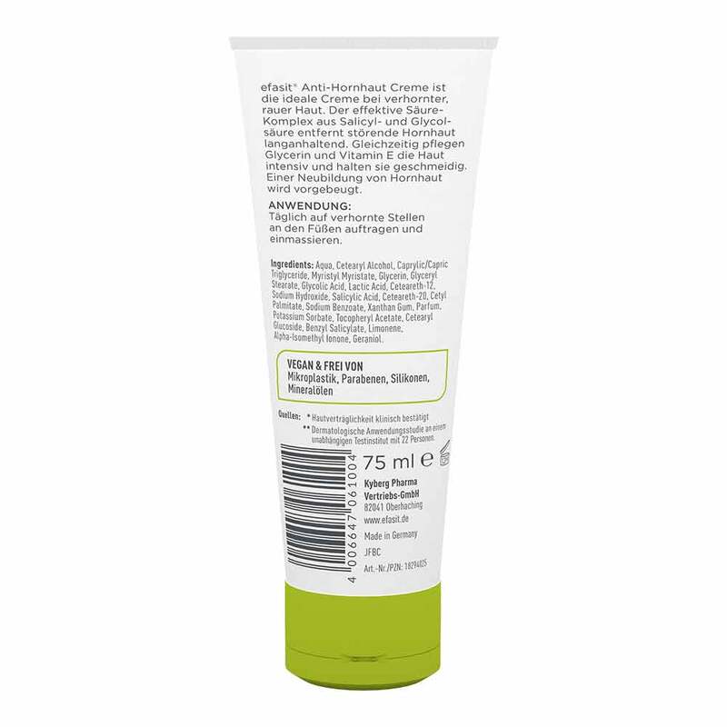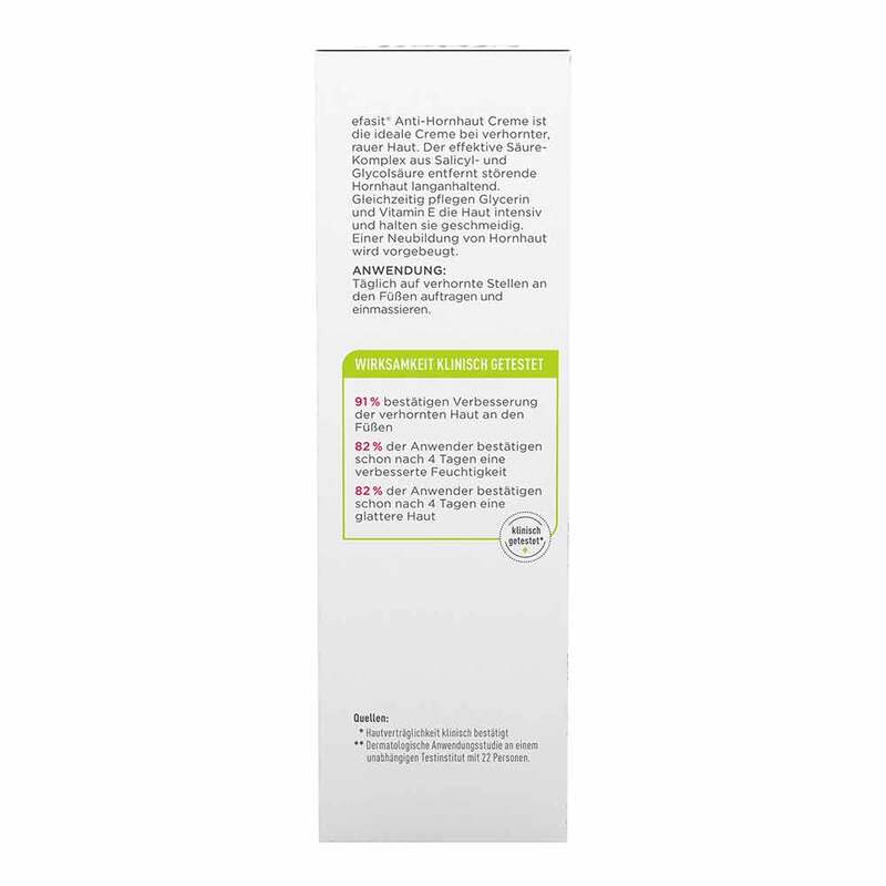 Die Efasit Anti-Hornhaut Creme ist die ideale Pflege bei verhornter, rauer Haut an den Füßen. Der Wirk-Komplex aus Salicylsäure und Glycolsäure entfernt störende Hornhaut effektiv und langanhaltend. Gleichzeitig pflegen Glycerin und Vitamin E die Haut intensiv und halten sie geschmeidig. Die Füße werden wieder weich und zart. Einer Neubildung von Hornhaut wird ebenfalls vorgebeugt.
