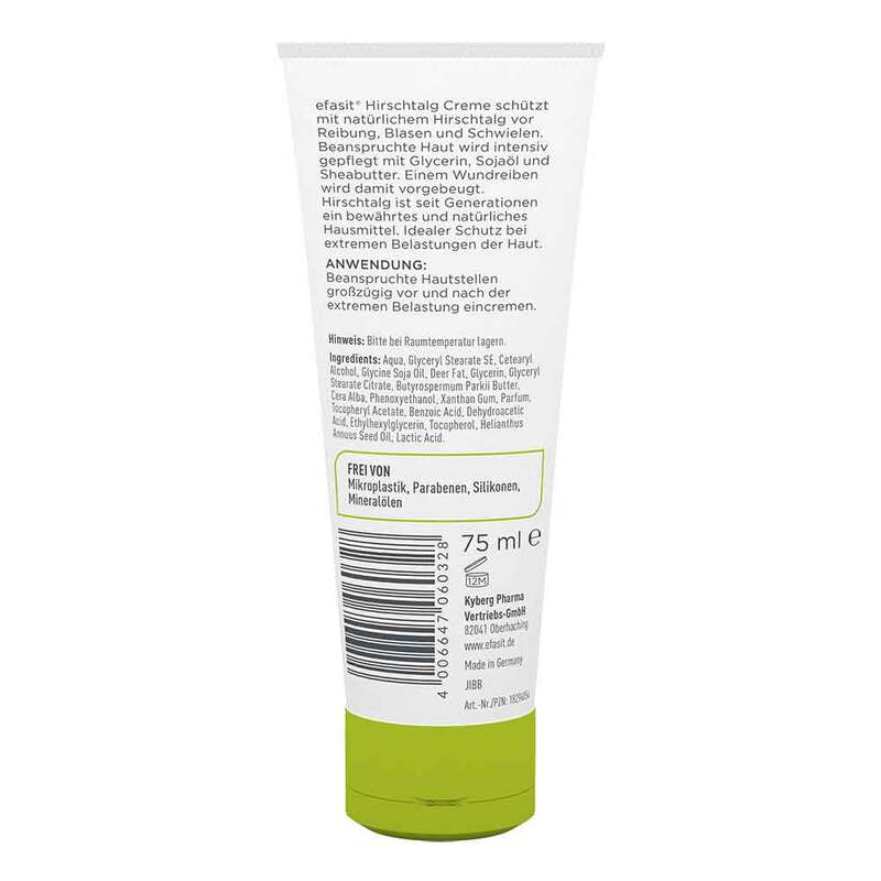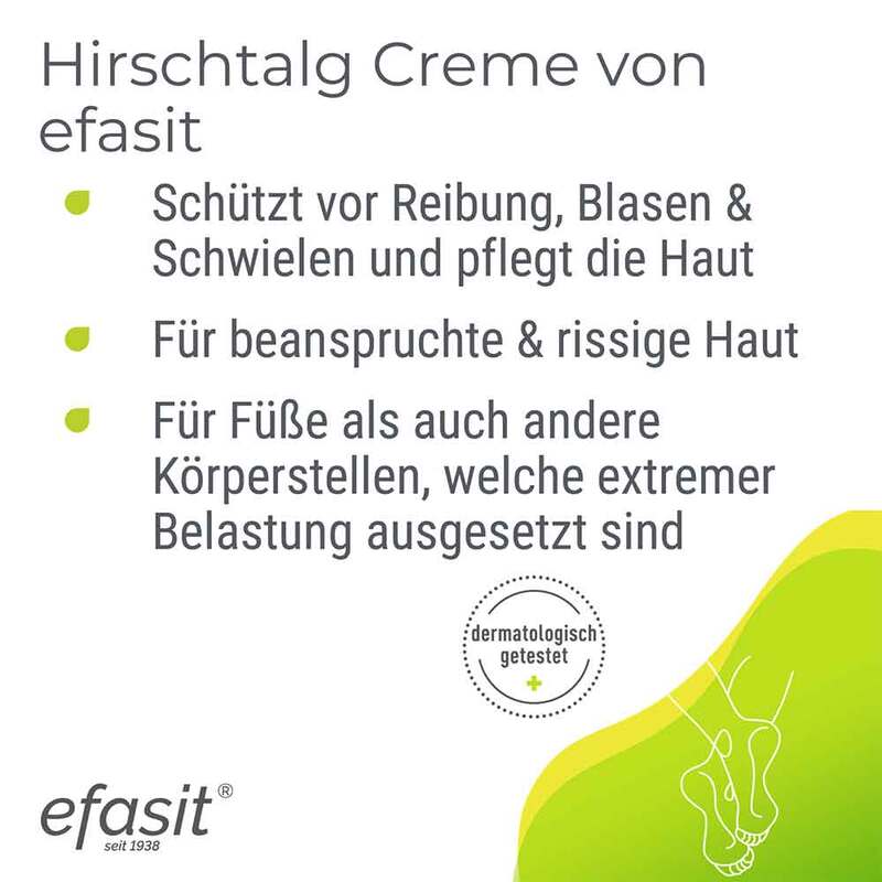 Efasit Hirschtalg Creme schützt mit natürlichem Hirschtalg vor Reibung, Blasen und Schwielen. Beanspruchte Haut wird intensiv gepflegt mit Glycerin, Sojaöl und Sheabutter. Durch die rückfettende Schutzschicht wird einem Wundreiben vorgebeugt. Hirschtalg ist seit Generationen ein bewährtes und natürliches Hausmittel.