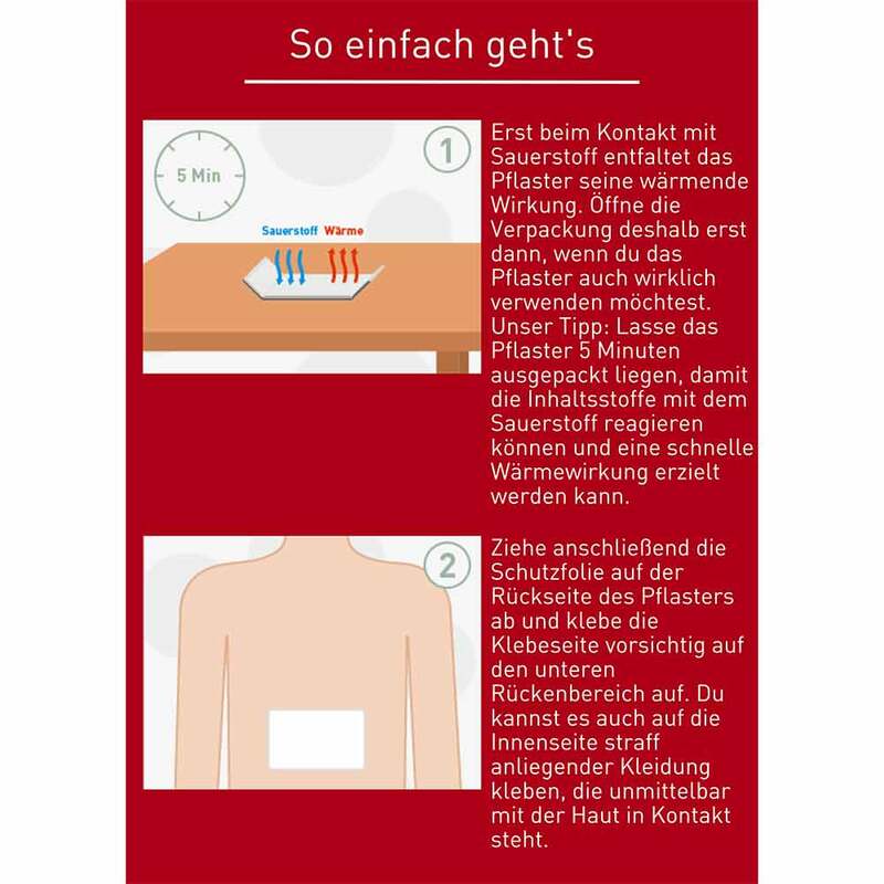 1. Erst beim Kontakt mit Sauerstoff entfaltet das Pflaster seine wärmende Wirkung. Öffnen Sie die Verpackung des Pflasters deshalb erst dann, wenn Sie das Pflaster auch wirklich verwenden möchten. Unser Tipp: Lassen Sie das Pflaster 5 Minuten ausgepackt liegen, damit die Inhaltsstoffe mit dem Sauerstoff reagieren können und eine schnelle Wärmewirkung erzielt werden kann.