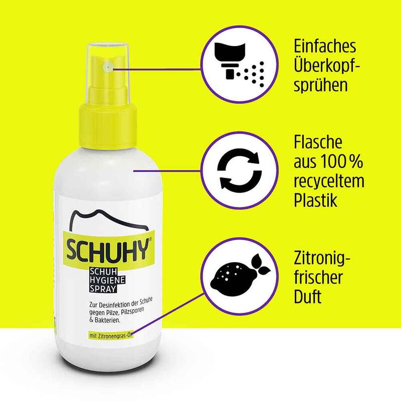 Fuß- oder Nagelpilz überträgt sich häufig vom eigenen Fuß auf die getragenen Schuhe. So kann es dazu kommen, dass man sich, nach erfolgreicher Therapie der Füße, wieder am eigenen Schuh einen Fuß- oder Nagelpilz einfängt. Um diese Wiederansteckungen durch die eigenen Schuhe vorzubeugen hat Dr. Pfleger in Zusammenarbeit mit Experten der mycoclinic in Berlin das Schuhspray SCHUHY® entwickelt.