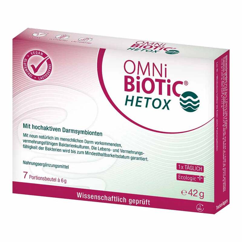 1 x täglich 1 Beutel Omni-Biotic Hetox (= 6 g) in ca. 1/8 l Wasser einrühren, mindestens 1 Minute Aktivierungszeit abwarten, nochmals umrühren und dann trinken. Empfehlenswert ist die Einnahme auf möglichst leeren Magen.