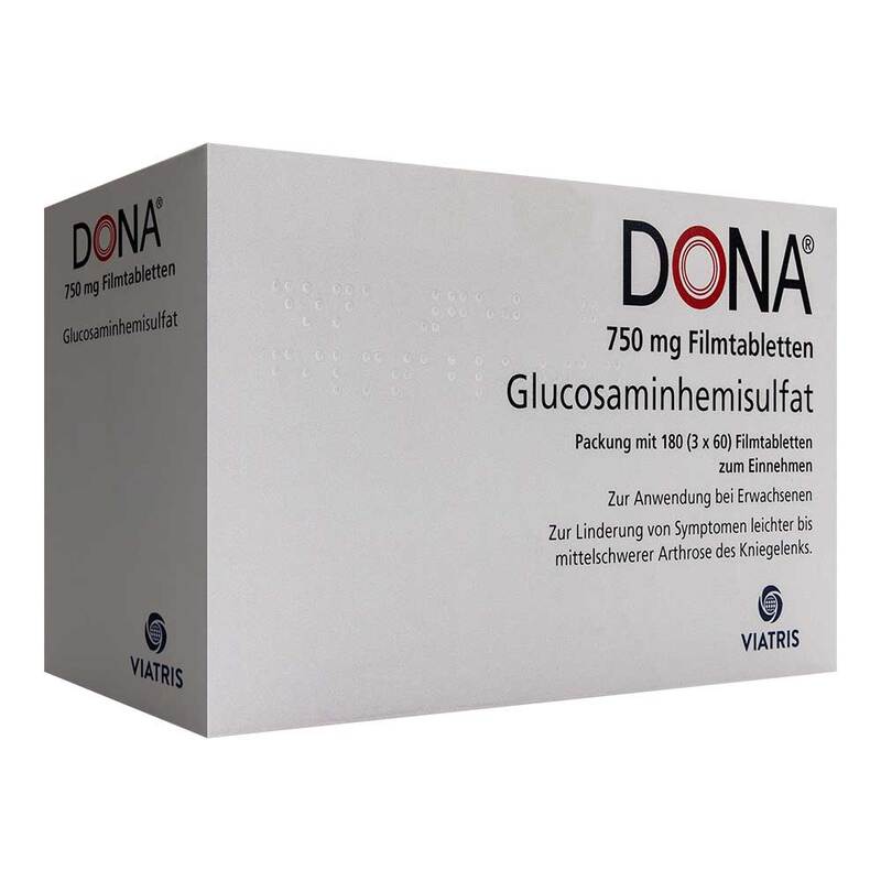 dona® 750 mg Filmtabletten. Anw.: Linderung von Symptomen leichter bis mittelschwerer Arthrose des Kniegelenks. Wirkstoff: Glucosaminhemisulfat. Zu Risiken und Nebenwirkungen lesen Sie die Packungsbeilag und fragen Sie Ihre Ärztin, Ihren Arzt oder in Ihrer Apotheke. Stand 11/22.