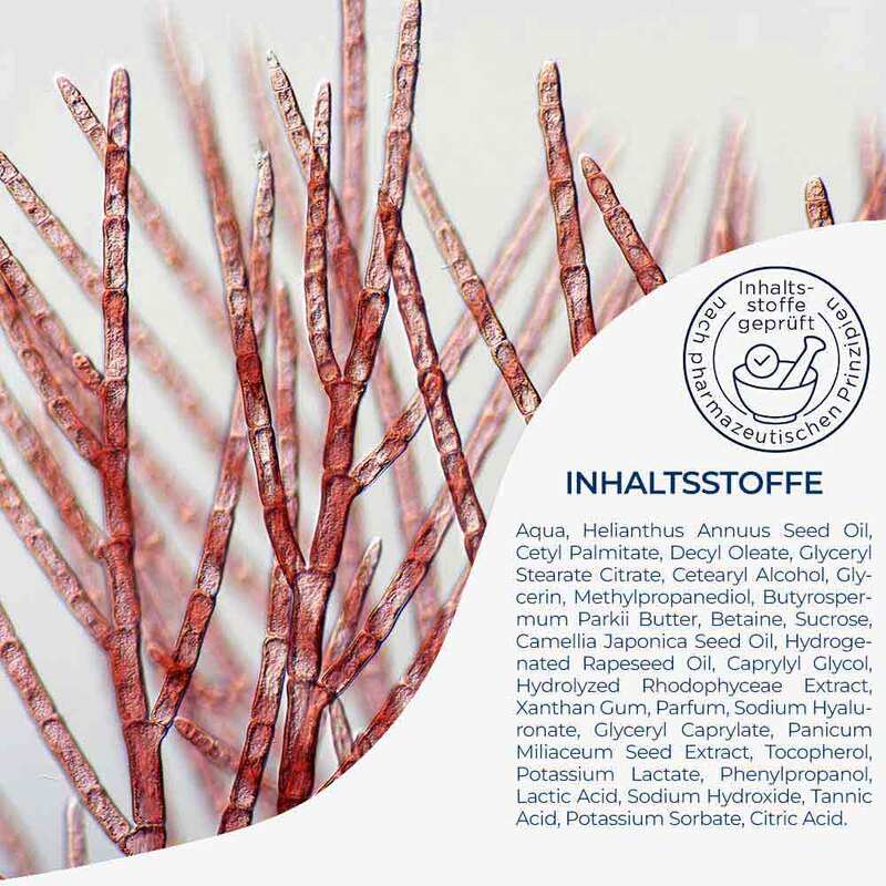 Aqua, Helianthus Annuus Seed Oil, Cetyl Palmitate, Decyl Oleate, Glyceryl Stearate Citrate, Cetearyl Alcohol, Glycerin, Methylpropanediol, Butyrospermum Parkii Butter, Betaine, Sucrose, Camellia Japonica Seed Oil, Hydrogenated Rapeseed Oil, Caprylyl Glycol, Hydrolyzed Rhodophyceae Extract, Xanthan Gum, Parfum, Sodium Hyaluronate, Glyceryl Caprylate, Panicum Miliaceum Seed Extract, Tocopherol, Potassium Lactate, Phenylpropanol, Lactic Acid, Sodium Hydroxide, Tannic Acid, Potassium Sorbate, Citric Acid.