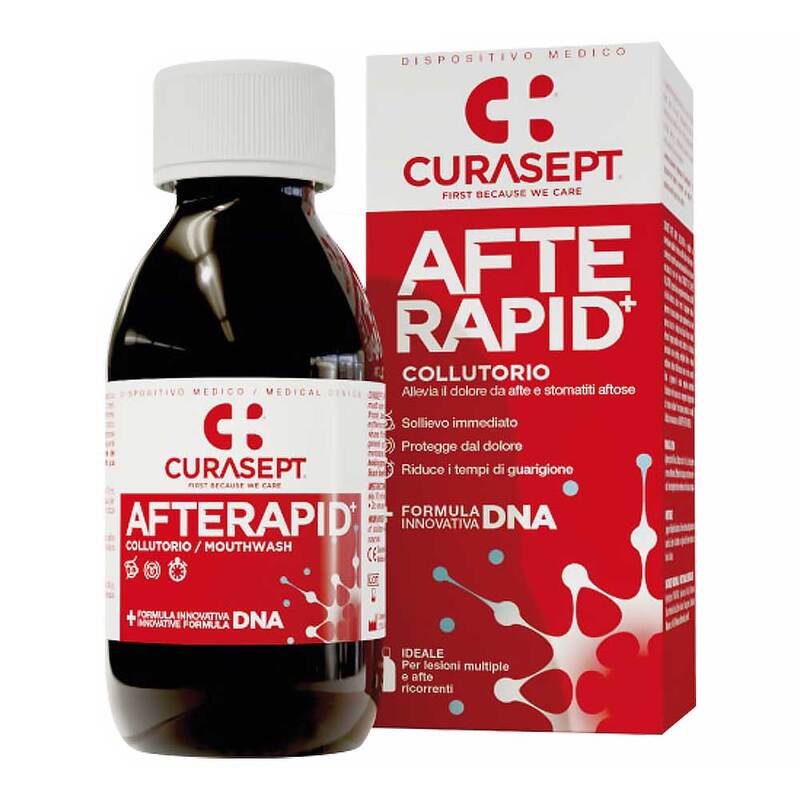 Curasept Afte Rapid Mundspülung lindert Schmerzen aufgrund von Aphthen und Infektionen der Mundschleimhaut. Es bildet einen schützenden Lipidfilm auf der Verletzung und hilft, das Zahnfleischgewebe zu regenerieren, indem es die Hydratation der Schleimhäute erhöht und damit die Trophik der Zellen verbessert.