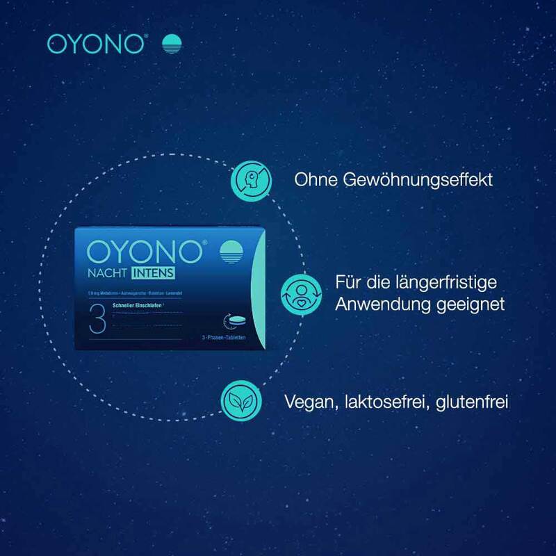 Oyono Nacht Intens kombiniert auf neue und einzigartige Weise die pflanzlichen Extrakte aus Baldrian, Lavendel und Ashwagandha mit 1,9 mg Melatonin. Dabei nutzt Oyono Nacht Intens die bereits bewährte 3-Phasen-Technologie von Oyono. Das Besondere ist, dass die enthaltenen Inhaltstoffe nach Einnahme der Tablette nicht gleichzeitig, sondern zeitlich versetzt während der Nacht freigesetzt werden.
