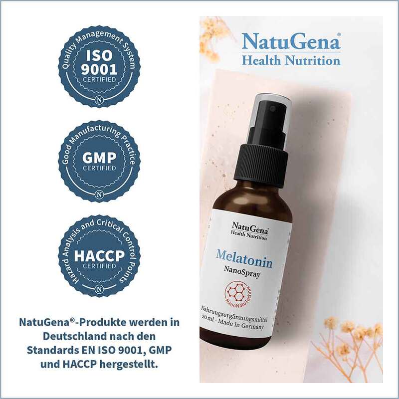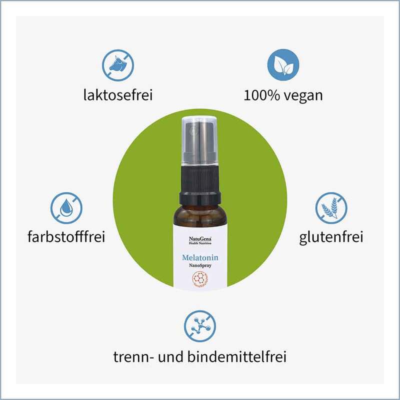 NatuGena Melatonin ist ein Nahrungsergänzungsmittel in praktischer Sprayform mit 1 mg Melatonin1 pro Sprühstoß. Die liposomale Emulsion unterstützt die effiziente Aufnahme von Melatonin. Das enthaltene Polysorbat 80 stabilisiert die Emulsion auch bei niedrigen Temperaturen und verhindert ein Ausflocken. Zusätzlich sorgt die neue Rezeptur mit natürlichen gemischten Tocopherolen für eine verbesserte Stabilität der Formulierung. Das Spray enthält flüssiges Melatonin in einer hochmodernen Formulierung für optimale Verwertung im Körper. Melatonin trägt dazu bei, die Einschlafzeit* zu verkürzen und es trägt zur Linderung der subjektiven Jetlag-Empfindungen* bei.