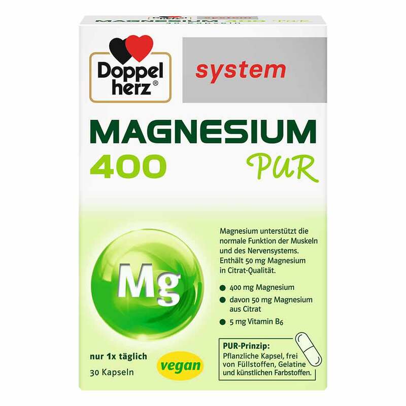 Doppelherz system enthält 400 mg Magnesium, davon 50 mg aus Magnesium-Citrat in Kombination mit Vitamin B6.