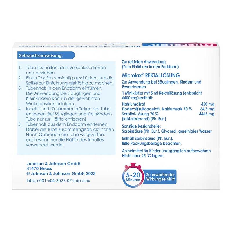 Microlax Rektallösung Klistiere.Anwendungsgebiete: Zur kurzfristigen Anwendung bei Verstopfung (Obstipation) sowie bei Erkrankungen, die eine erleichterte Stuhlentleerung (Defäkation) erfordern. Zur Darmentleerung bei diagnostischen oder therapeutischen Maßnahmen im Enddarmbereich. Warnhinweise: Enthält Sorbinsäure. Zu Risiken und Nebenwirkungen lesen Sie die Packungsbeilage und fragen Sie Ihre Ärztin, Ihren Arzt oder in Ihrer Apotheke. Kenvue Germany GmbH, 41470 Neuss. Stand: 05/2025