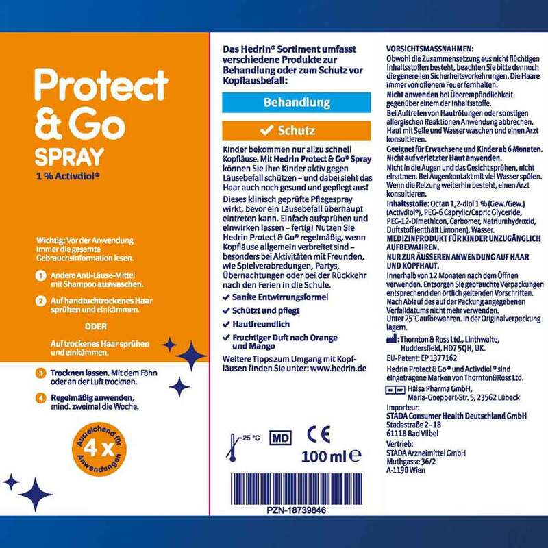 Hedrin® Protect&Go bietet eine wirksame Prävention gegen Kopflausbefall. Einfach nach dem Haarewaschen aufsprühen, trocknen lassen – und schon ist das Haar für 2-3 Tage oder bis zur nächsten Wäsche effektiv vor Läuseinfektionen geschützt!
