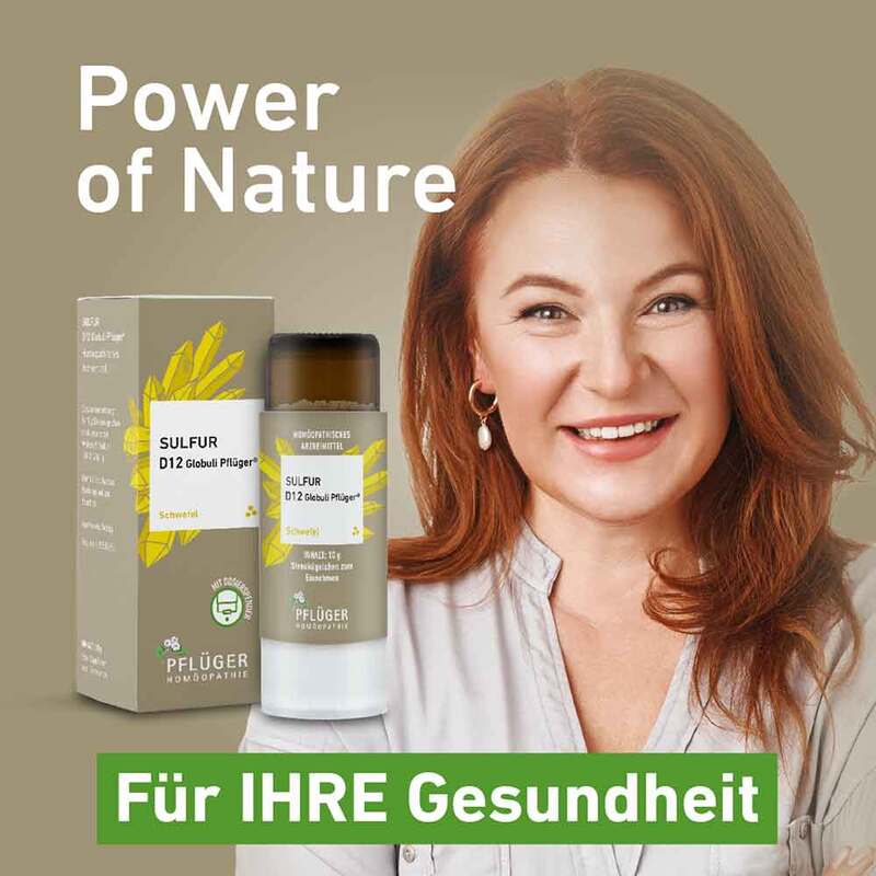 Sulfur C30 Globuli Pflüger®, Zusammensetzung: In 10 Streukügelchen sind verarbeitet: Wirkstoff: Sulfur Dil. C30 0,1 g. Sonstiger Bestandteil: Saccharose. Registriertes homöopathisches Arzneimittel, daher ohne Angabe einer therapeutischen Indikation. Gegenanzeigen / Nebenwirkungen: Keine bekannt. Enthält Saccharose. Packungsbeilage beachten. Zu Risiken und Nebenwirkungen lesen Sie die Packungsbeilage und fragen Sie Ihre Ärztin, Ihren Arzt oder in Ihrer Apotheke. Homöopathisches Laboratorium Alexander Pflüger GmbH & Co. KG 33378 Rheda-Wiedenbrück info@pflueger.de www.pflueger.de