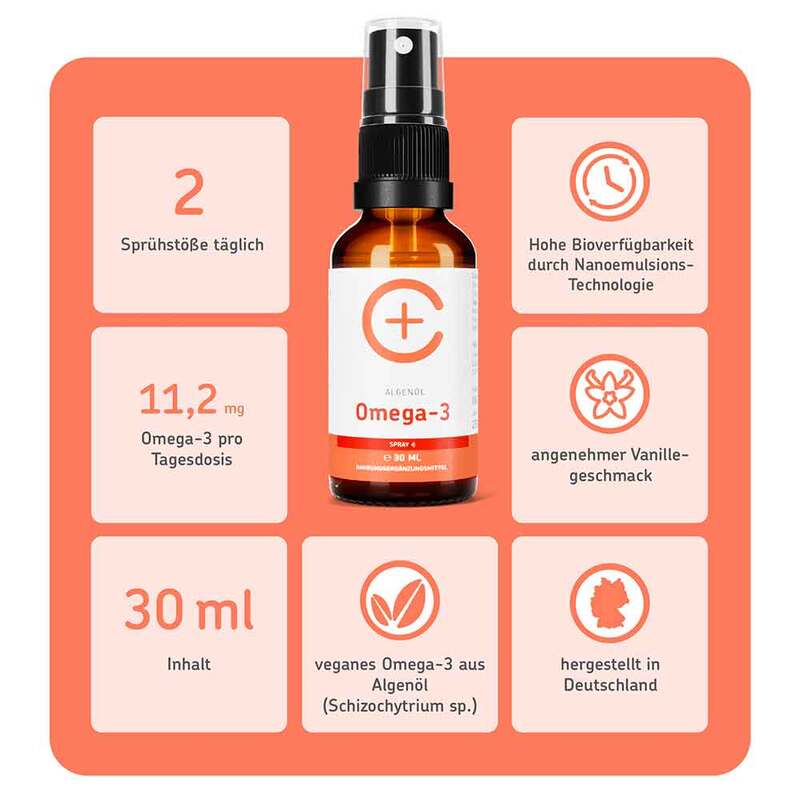 Das cerascreen® Vital Omega-3-Spray ist nicht nur hoch bioverfügbar, sondern enthält auch die essentiellen Fettsäuren DHA und EPA. Das Besondere daran: Es wird aus Algenöl hergestellt, wodurch es zu 100 % vegan ist und eine nachhaltigere Alternative zu Produkten aus Fischöl bietet.