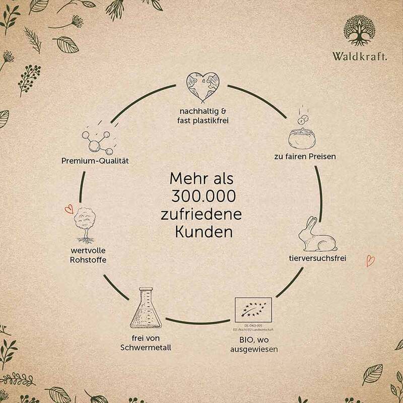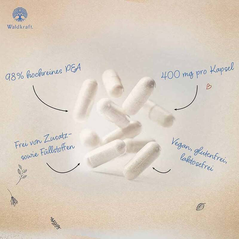 Die PEA-Kapseln von Waldkraft enthalten hochreines, ultramikronisiertes Palmitoylethanolamid in geprüfter Qualität. Jede Kapsel liefert Dir 400 mg PEA – frei von Zusätzen, nachhaltig verpackt und mit viel Sorgfalt in Berlin abgefüllt.