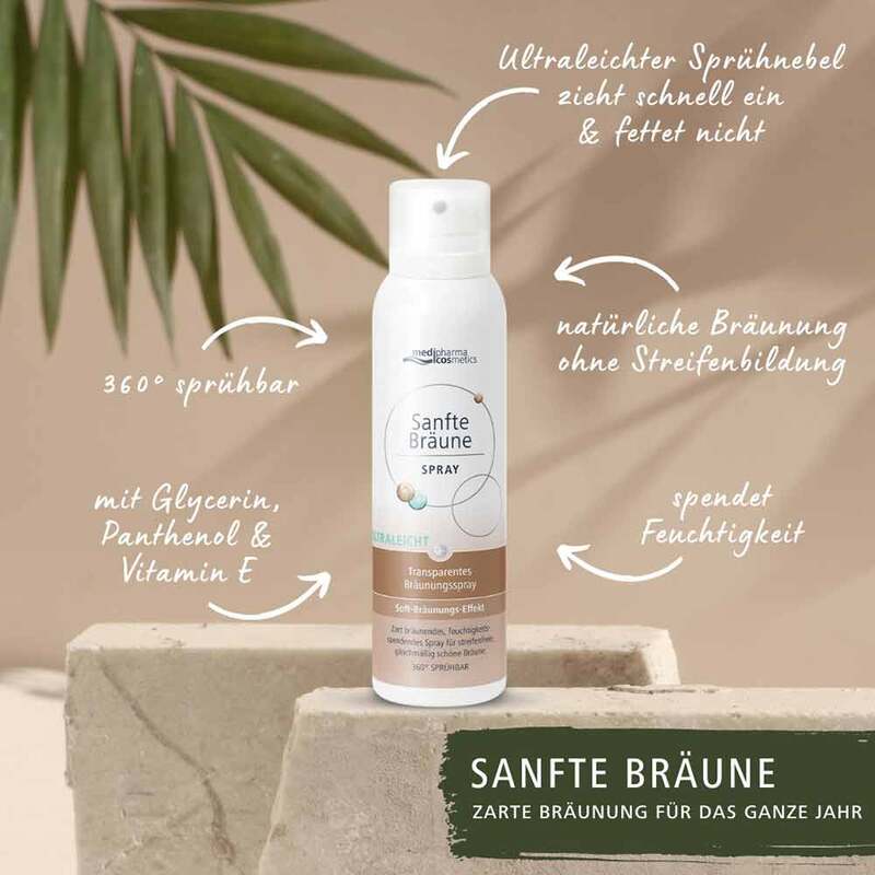 Das medipharma cosmetics Sanfte Bräune Aerosol-Spray schenkt Ihrer Haut eine sanfte und natürliche Sommerbräune. Für einen gleichmäßigen Bräunungs-Effekt ohne Streifenbildung.