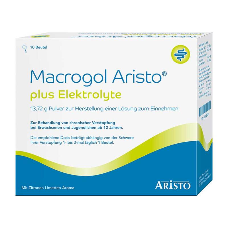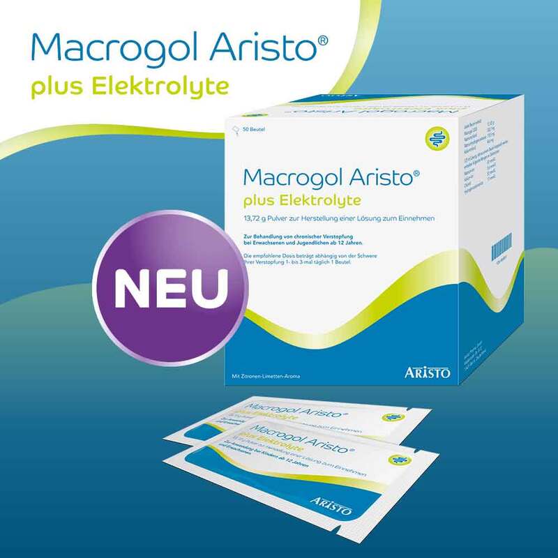 Macrogol Aristo® plus Elektrolyte 13,72 g, Pulver zur Herstellung einer Lösung zum Einnehmen.Wirkstoffe: Macrogol 3350, Natriumchlorid, Natriumhydrogencarbonat, Kaliumchlorid. Zur Behandlung von chronischer Verstopfung bei Erwachsenen und Jugendlichen über 12 Jahren. Zu Risiken und Nebenwirkungen lesen Sie die Packungsbeilage und fragen Sie Ihre Ärztin, Ihren Arzt oder in Ihrer Apotheke. (apothekenpflichtig). (Stand September 2024). Aristo Pharma GmbH, Wallenroder Straße 8-10, 13435 Berlin.