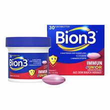 Füllstoff: Sorbit; Calciumcarbonat; Maltodextrin; Stärke; Vitamin C (Calcium-L-ascorbat); Trennmittel: Mono- und Diglyceride von Speisefettsäuren; Färbendes Lebensmittel: Konzentrat aus Rote Beete; Säureregulator: Äpfelsäure; Trennmittel: Magnesiumsalze der Speisefettsäuren; Eisenfumarat; Vitamin E (DL-α-Tocopherylacetat); Niacin (Nicotinamid); Glukosesirup; Modifizierte Stärke; Zinkoxid; Pantothensäure (Calcium-D-pantothenat); Bakterien der Darmflora Lactobacillus gasseri PA 16/8, Bifidobacterium bifidum MF 20/5, Bifidobacterium longum SP 07/3 (Kann Spuren von Milch, Fisch und Soja enthalten); Emulgator: Gummi arabicum; Vitamin B6 (Pyridoxinhydrochlorid); Vitamin B1 (Thiaminmononitrat); Säureregulator: Citronensäure; Himbeeraroma; Vitamin B2 (Riboflavin); Zucker; Vitamin A (Retinylacetat); Süßungsmittel: Acesulfam K, Natriumsaccharin; Folsäure (Pteroylmonoglutaminsäure); Biotin (D-Biotin); Vitamin D (Cholecalciferol); Vitamin B12 (Cyanocobalamin).