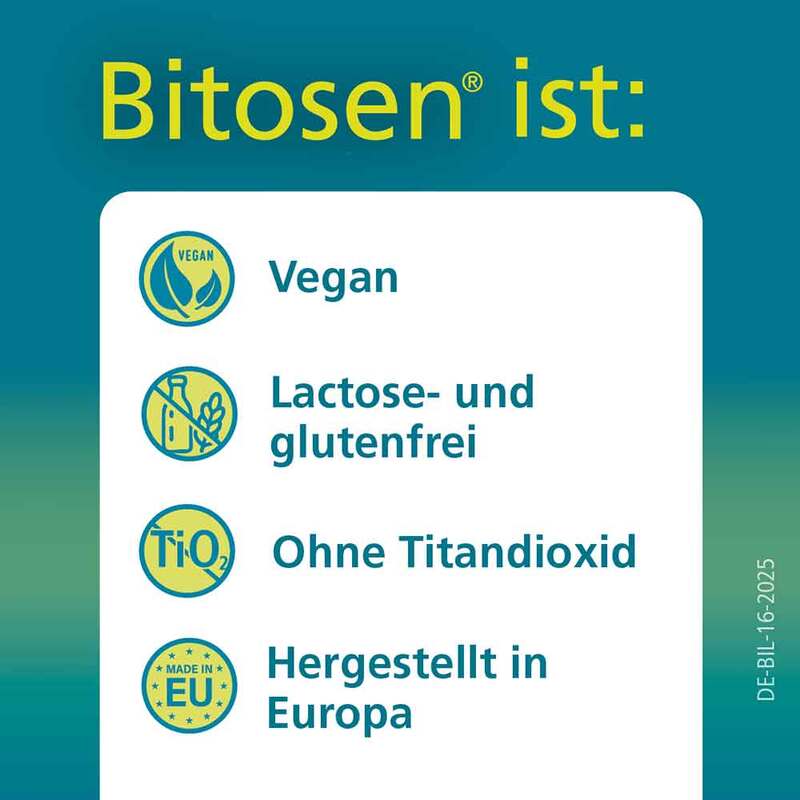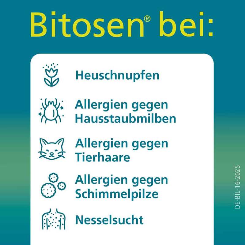 Bitosen® 20 mg Tabletten, Bitosen® 20 mg Schmelztabletten. Wirkstoff: Bilastin. Anwendungsgebiete: Für Erwachsene und Jugendliche ab 12 Jahren zur Linderung der Beschwerden von Heuschnupfen, anderer Formen allergischer Rhinitis sowie juckenden Hautausschlägen. Warnhinweis: Bitosen® 20 mg Schmelztabletten: Enthält Ethanol. Packungsbeilage beachten. Zu Risiken und Nebenwirkungen lesen Sie die Packungsbeilage und fragen Sie Ihre Ärztin, Ihren Arzt oder in Ihrer Apotheke. Pharmazeutischer Unternehmer: Menarini International Operations Luxembourg S.A., Mitvertrieb durch BERLIN-CHEMIE AG, 12489 Berlin.
