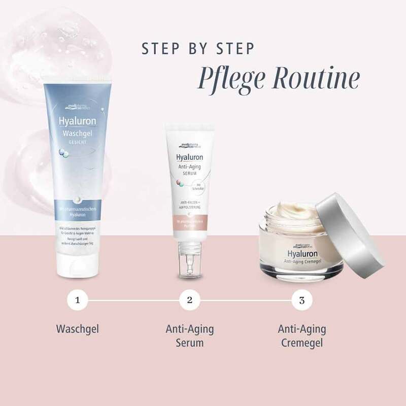 Für eine gründliche Pflege-Routine werden folgende Schritte empfohlen: Gestartet wird mit dem Hyaluron Waschgel, anschließend wird das Hyaluron Feuchtigkeit Serum auf die Haut aufgetragen und zum Schluss wird das Hyaluron 48h Feuchtigkeit Cremegel angewandt. Das Waschgel reinigt und entfernt Make-Up sowie überschüssigen Talg, das leichte, fast wässrige Serum spendet Feuchtigkeit mit Soforteffekt und das Cremegel versorgt die Haut langanhaltend mit Feuchtigkeit. Für eine Hautpflege mit System.