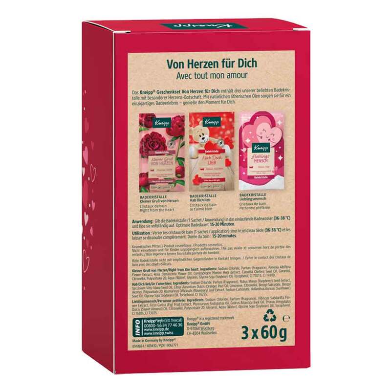 Das Kneipp® Geschenkset Von Herzen für Dich enthält drei unserer beliebten Badekristalle mit besonderer Herzens-Botschaft. Mit natürlichen ätherischen Ölen sorgen sie für ein einzigartiges Badeerlebnis genieße den Moment für Dich.