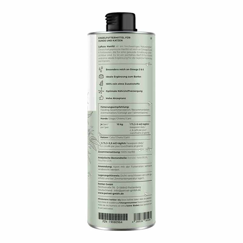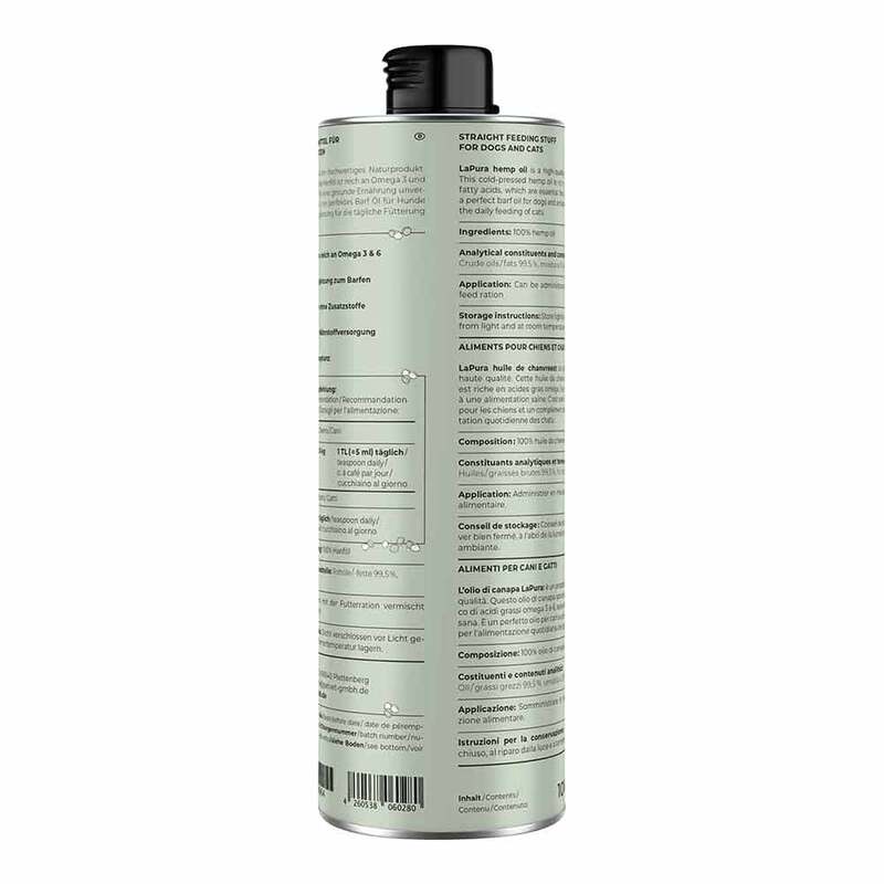 LaPura Hanföl ist ein hochwertiges Naturprodukt. Dieses kaltgepresste Hanföl ist reich an Omega 3 und 6 Fettsäuren, die für eine gesunde Ernährung unverzichtbar sind. Es ist ein perfektes Barf Öl für Hunde und eine ideale Ergänzung für die tägliche Fütterung von Katzen.