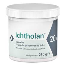 Ichtholan® Zugsalbe 20%. Wirkstoff: Ammoniumbituminosulfonat Anwendungsgebiete: Zur Reifung von Furunkeln und oberflächlich abszedierenden Prozessen, z. B. Nagelbett-, Haarbalg-, Schweißdrüsen-Entzündungen, Entzündungen durch Splitter und Dornen. Enthält Wollwachs und Butylhydroxytoluol. Zu Risiken und Nebenwirkungen lesen Sie die Packungsbeilage und fragen Sie Ihre Ärztin, Ihren Arzt oder in Ihrer Apotheke. Ichthyol-Gesellschaft Cordes, Hermanni & Co. (GmbH & Co.) KG, 22335 Hamburg
