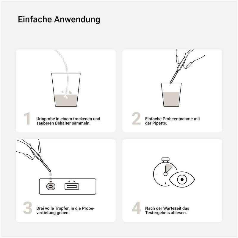 Schneller & sicherer Nachweis:Warten Sie, bis die Färbung der Linie(n) entsteht. Bereits nach etwa 5 Minuten können Sie das Ergebnis ablesen. Nach 10 Minuten sollte der Nachweis kritisch bewertet werden, da er ungenau sein könnte.