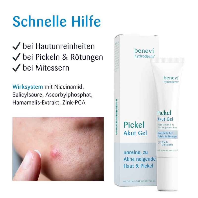 Benevi Hydroderm Pickel Akut Gel ist ein fettfreies SOS-Gel zur gezielten Anwendung bei einzelnen Pickeln. Salicylsäure und Ascorbylphosphat reduzieren Hautunreinheiten, während Niacinamid dazu beiträgt, Pickelrötungen zu mindern. Alkohol und Zink-PCA wirken antibakteriell.