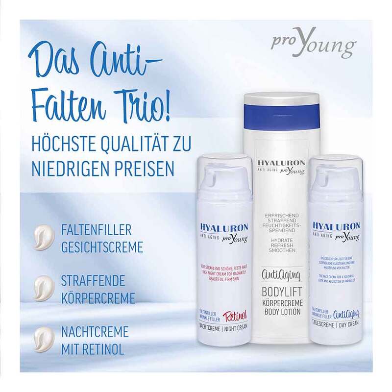 Die Hyaluron Proyoung Anti Aging Faltenfiller Nachtcreme zeichnet sich durch die ausgewogene Kombination von Hyaluronsäure, Aloe Vera und Retinol aus. Die Haut wird über Nacht entspannt, regeneriert und optimal gepflegt.