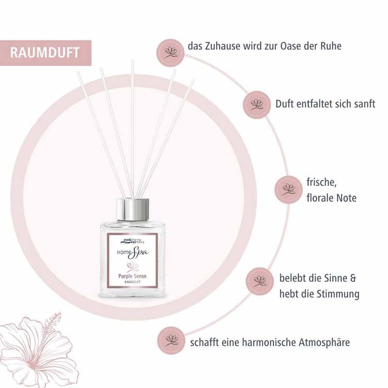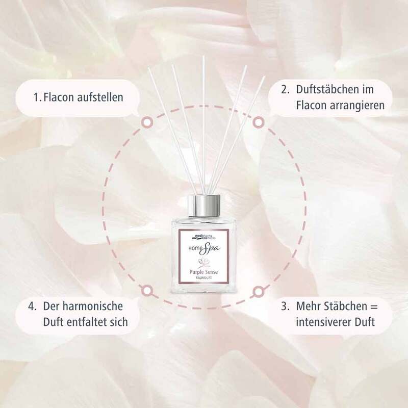 In einer hektischen Welt, in der Stress häufig alltäglich ist, sehnen sich viele Menschen nach kleinen Momenten der Entspannung und Gelassenheit. Der medipharma cosmetics Home Spa Purple Sense Raumduft schenkt Ihnen genau das! Tauchen Sie ein in die Welt blumiger Frische, in der zarte florale Noten mit einer erfrischenden Leichtigkeit verschmelzen. Egal ob im Bad, im Wohnzimmer oder im Büro: Das schlichte Design mit weißen Duftstäbchen fügt sich optisch ideal in jede Umgebung ein.