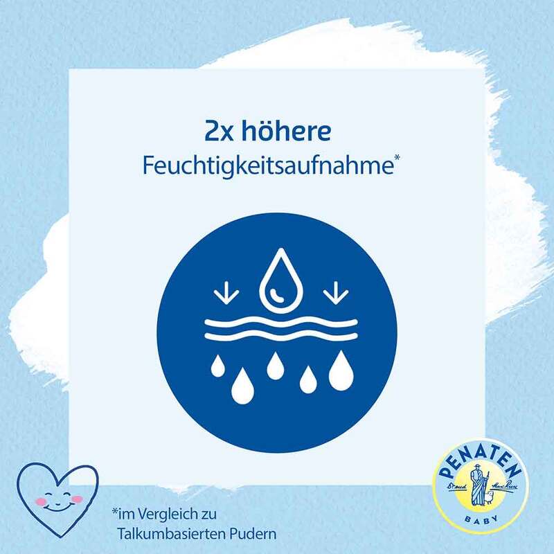 Im Vergleich zu Pudern, die auf Talg basieren, hat dieses Baby Puder eine 2x höhere Feuchtigkeitsaufnahme, um die Haut Ihres Babys trocken zu halten.