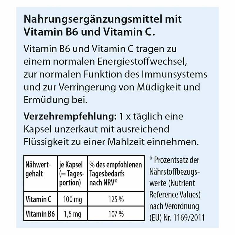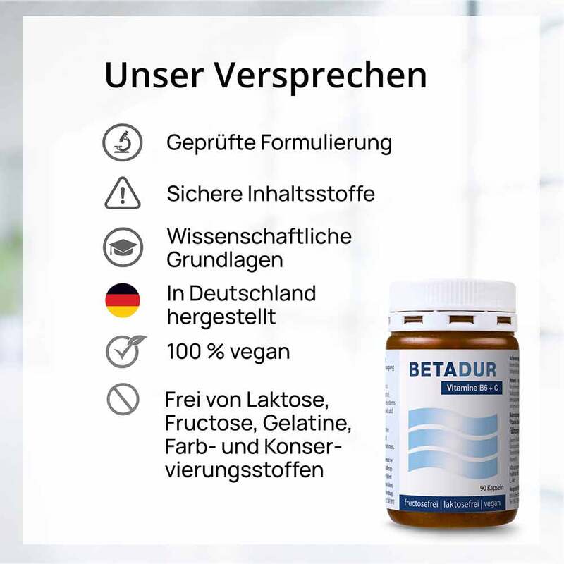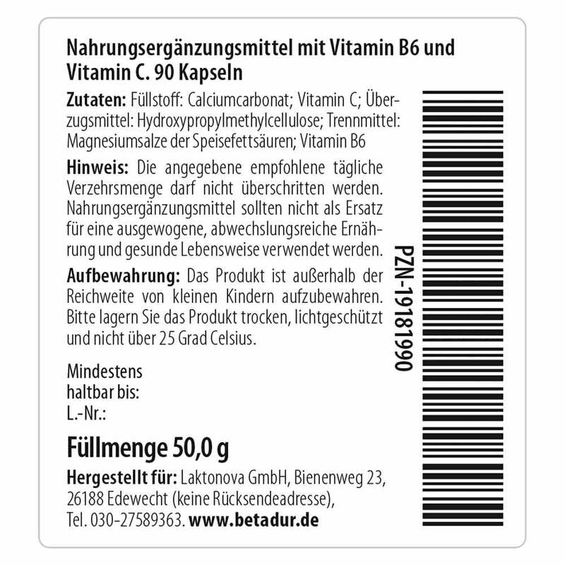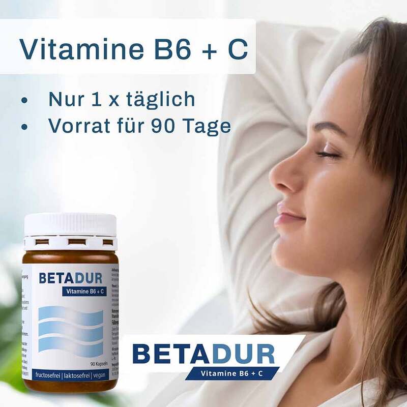 - Mit Betadur© Kapseln versorgen Sie sich täglich mit 107 % des Tagesbedarfs (NRV*) an Vitamin B6 und 125 % des Tagesbedarfs (NRV*) an Vitamin C.