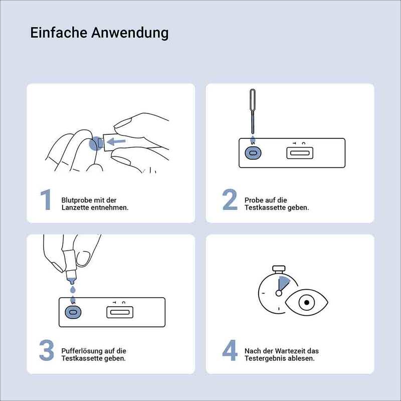 Selbst durchführbar: Die Durchführung ist unkompliziert und kann leicht von zuhause aus erfolgen. Es sind keine medizinischen Vorkenntnisse oder spezielle Geräte notwendig. Eine detaillierte Anleitung zum Nachlesen findet sich in der Gebrauchsanweisung.