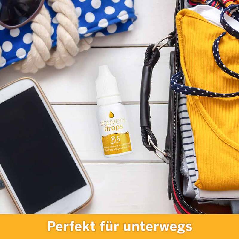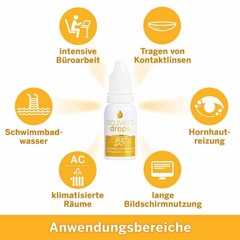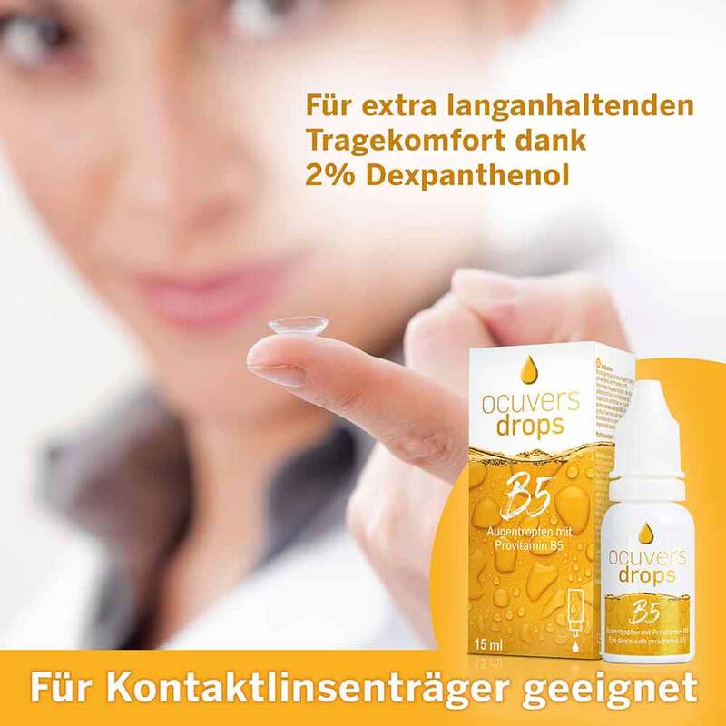 Ocuvers drops B5 Augentropfen werden eingesetzt bei trockenen, müden oder gereizten Augen. Diese Beschwerden können aufgrund äußerer Einflüsse, wie Umgebungsluft, Tabakrauch oder Pollen verursacht werden. Ocuvers drops B5 Augentropfen bestehen aus einer sterilen, viskösen Lösung auf der Basis von Provitamin B5. Dieser fördert und unterstützt die selbstregenerierenden Eigenschaften der Hornhaut. Die Augentropfen sind geeignet für die Anwendung mit allen Kontaktlinsentypen.