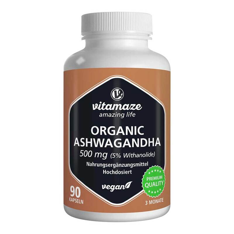 Organic Ashwagandha-Wurzelextrakt (Withania somnifera, Wurzel) mit 5% Withanolide, Überzugsmittel (Hydroxypropylmethylcellulose; pflanzliche Kapselhülle), Trennmittel (Cellulose).