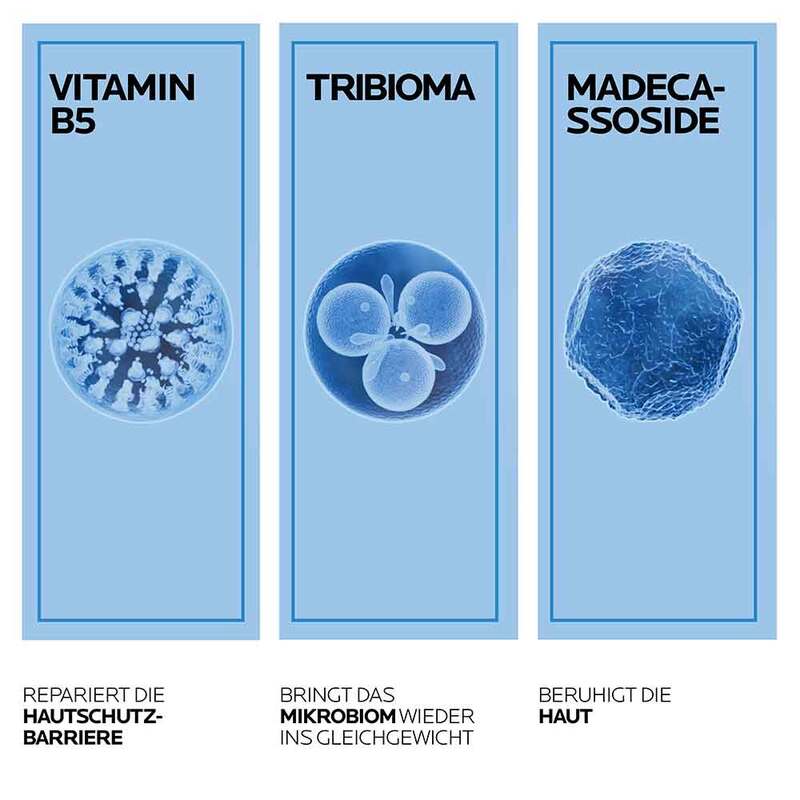 Die beruhigenden und regenerierenden Inhaltsstoffe Panthenol (Vitamin B5), Madecassoside, ein einzigartiger präbiotischen Tribioma Komplex und patentiertes Procerad sorgen für eine effektive Pflege.