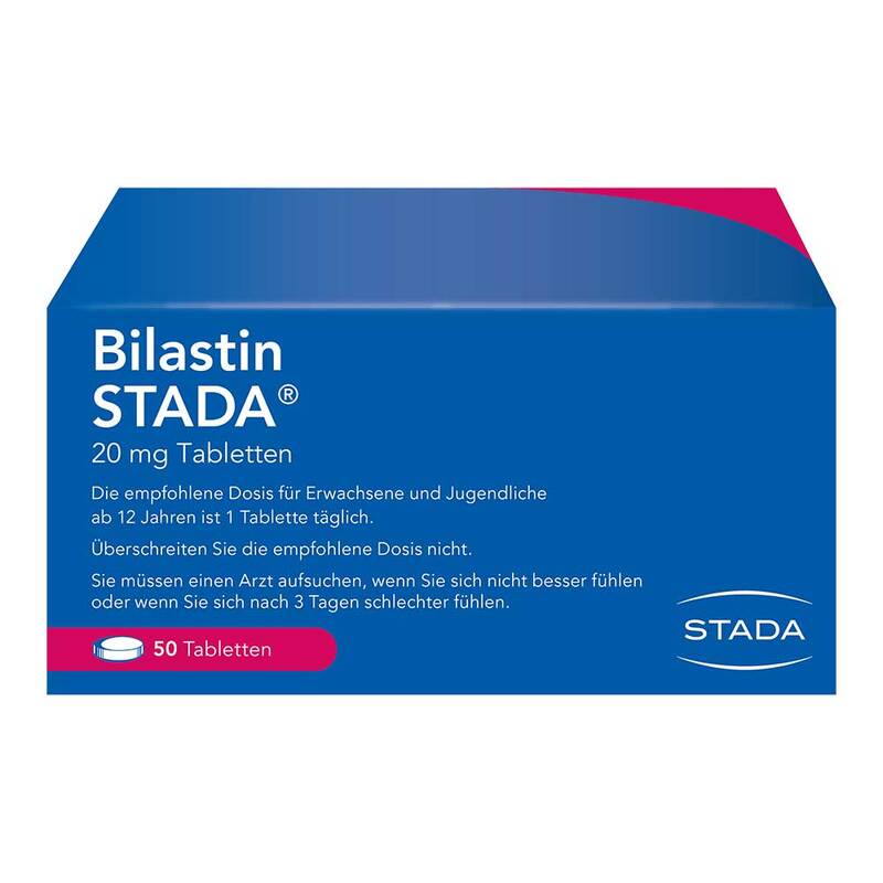 Bilastin STADA® 20 mg Tabletten. Zur Anwendung bei Erwachsenen und Jugendlichen ab 12 Jahren Wirkstoff: Bilastin. Linderung der Beschwerden von Heuschnupfen (Niesen, juckende, laufende, verstopfte Nase und rote und tränende Augen) sowie anderer Formen allergischer Rhinitis. Es kann auch angewendet werden, um juckende Hautausschläge (Nesselsucht oder Urtikaria) zu behandeln. Hinweis: Überschreiten Sie die empfohlene Dosis nicht. Zu Risiken und Nebenwirkungen lesen Sie die Packungsbeilage und fragen Sie Ihre Ärztin, Ihren Arzt oder in Ihrer Apotheke. STADA Consumer Health Deutschland GmbH, Stadastraße 2–18, 61118 Bad Vilbel Stand: Januar 2025