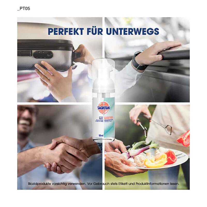 Unterwegs kommen unsere Hände mit besonders vielen Keimen und Bakterien in Berührung, gründliche Hand-Hygiene ist dann oft nötig, doch nicht immer möglich. Hierfür bietet der antibakterielle Sagrotan® Handschaum eine hygienische und effektive Desinfektion der Hände - auch ohne Wasser und ohne zu kleben.