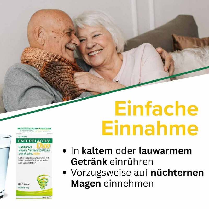 Enterolactis Duo Pulver ist ein Nahrungsergänzungsmittel mit lebenden Milchsäurebakterien, welche natürlicherweise im menschlichen Darm vorkommen. Zusätzlich ist der Ballaststoff Inulin enthalten. Enterolactis Duo ist mit 8 Milliarden lebenden Milchsäurebakterien und 4 g Inulin pro Beutel.