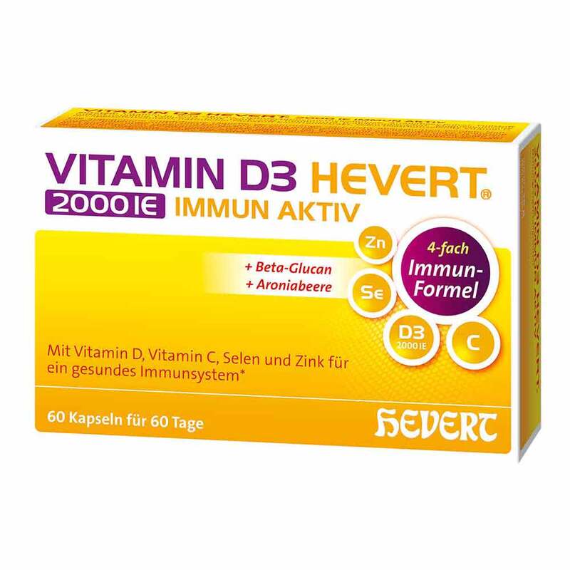 Vitamin D3 Hevert 2000 IE Immun Aktiv enthält vier Mikronährstoffe, Vitamin D, Vitamin C, Selen und Zink sowie zusätzlich Beta-Glucan und Aroniabeeren-Pulver. Die Mikronährstoffe sind an wichtigen Prozessen der Immunabwehr beteiligt und sorgen so für ein gesundes Immunsystem.*