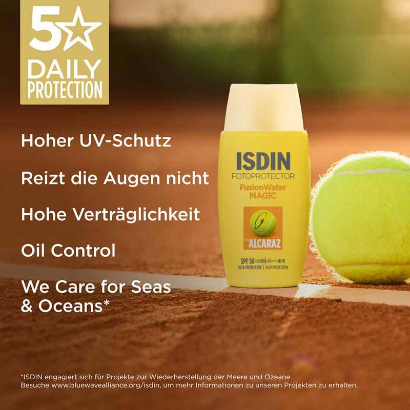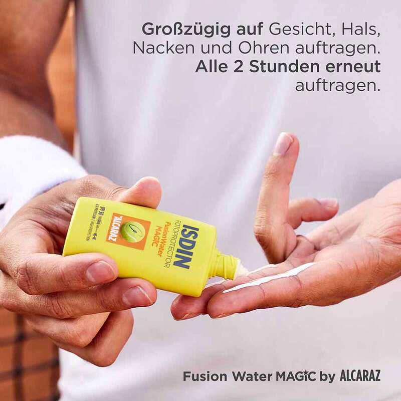 Als Sportler oder aktiver Mensch wissen Sie, dass Ihre Haut beim Training im Freien besonderen Belastungen ausgesetzt ist. Hitze, Schweiß und vor allem intensive Sonneneinstrahlung können die Haut stark beanspruchen. Genau dafür wurde die ISDIN Fusion Water MAGIC by Alcaraz LSF 50 Sonnencreme für das Gesicht entwickelt: Ihr ultimativer Sonnenschutz für das Gesicht mit hohem LSF 50, der Sie bei jeder Aktivität optimal unterstützt und Ihre Haut umfassend schützt.