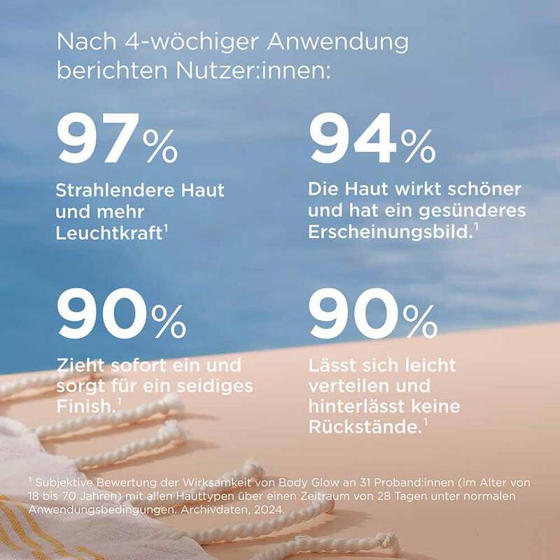 ¹ Subjektive Bewertung der Wirksamkeit von Body Glow an 31 Probanden (18–70 Jahre) mit allen Hauttypen über 28 Tage unter normalen Anwendungsbedingungen. Daten vorliegend, 2024.