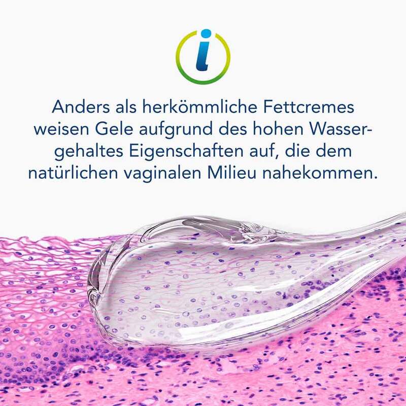 Das Vaginalgel bildet auf den betroffenen trockenen Stellen einen schützenden Film und sorgt mit wasserbindenden Substanzen (z. B. Hyaluronsäure) für eine anhaltende Befeuchtung in der Scheide und im Bereich des Scheideneingangs.