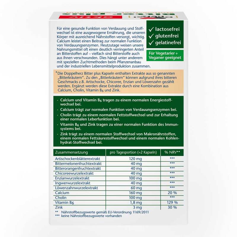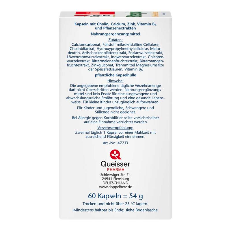 Calciumcarbonat, Füllstoff mikrokristalline Cellulose, Cholinbitartrat, Hydroxypropylmethylcellulose, Maltodextrin, Artischockenblätterextrakt, Enzianwurzelextrakt, Löwenzahnwurzelextrakt, Ingwerwurzelextrakt, Chicoreewurzelextrakt, Bittermelonenfruchtextrakt, Bitterorangenfruchtextrakt, Zinkgluconat, Trennmittel Magnesiumsalze der Speisefettsäuren, Vitamin B6