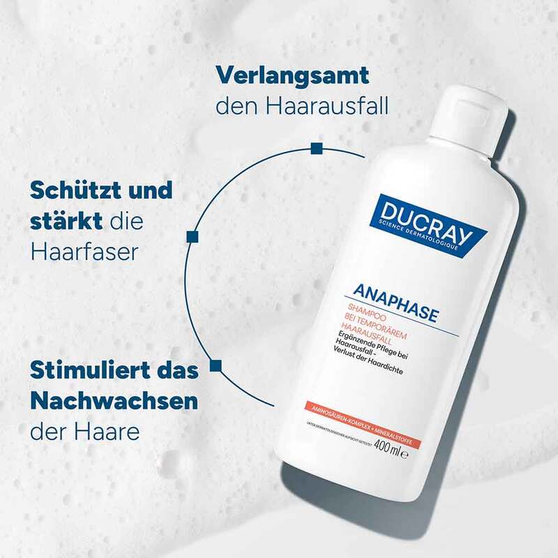 Das Anaphase Shampoo wurde speziell als Ergänzung für eine Behandlung bei temporärem Haarausfall entwickelt. Bei temporärem Haarausfall wird ergänzend die Anaphase Creastim Lotion von Ducray empfohlen.