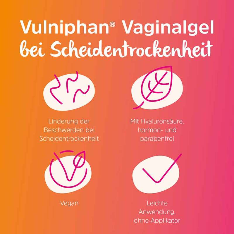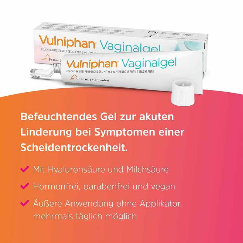Vulniphan® Vaginalgel bildet auf den betroffenen trockenen Stellen einen schützenden Film und sorgt mit wasserbindenden Substanzen (z. B. Hyaluronsäure) für eine anhaltende Befeuchtung. Durch einen Zusatz von Milchsäure unterstützt das Gel zusätzlich die Aufrechterhaltung des natürlich sauren pH-Wertes in der Scheide und trägt so zum Schutz der Scheidenflora bei.